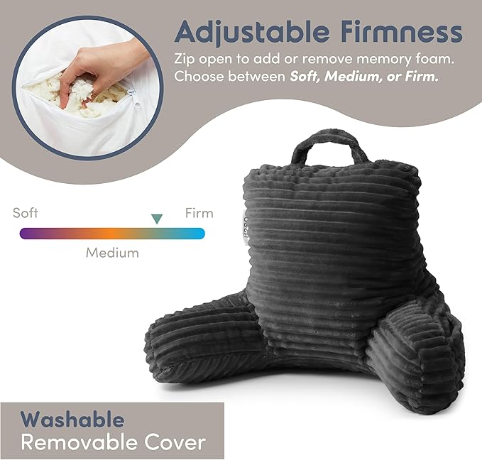 - Customizable Support for Back, Neck & Arms - No more slouching or back strain. Our back pillow for bed sitting up features adjustable shredded memory foam that you can shift, add, or remove for personalized firmness. Get the perfect angle whether you're working, recovering, or unwinding.