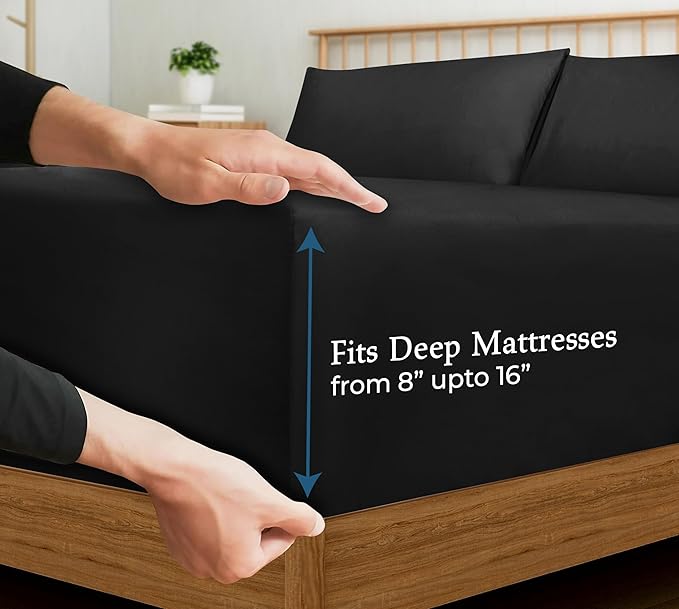 Royale Linens 400 Thread Count 100% American Grown Cotton Fitted Sheet Queen Size - All Around Elastic Fitted Sheet - Luxury Sateen Weave - Snug Fit Bottom Sheets Fit Up to 16" (Queen,Night Black)