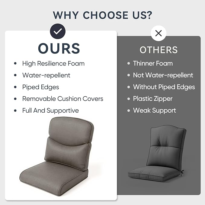 - Perfect Fit & Generous Dimensions: Achieve a custom-fit look with our patio cushion set, including seat cushion (22" W x 24" D x 4" T) and back cushion (22" W x 22" H x 6" T). This deep seat cushion and tall back are designed for superior comfort and support on most outdoor furniture. Pro Tip: For the perfect fit, we recommend measuring your furniture's seating area before ordering to ensure ideal coverage and a seamless look