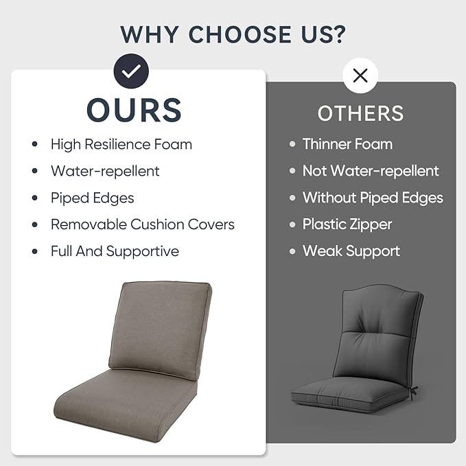 - Perfect Fit & Generous Dimensions: Achieve a custom-fit look with our patio cushion set, including seat cushion (22" W x 24" D x 4" T) and back cushion (22" W x 22" H x 6" T). This deep seat cushion and tall back are designed for superior comfort and support on most outdoor furniture. Pro Tip: For the perfect fit, we recommend measuring your furniture's seating area before ordering to ensure ideal coverage and a seamless look